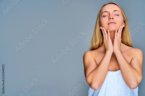 Girl in a white bath towel with closed eyes touches face and neck with her hands. Beauty concept
