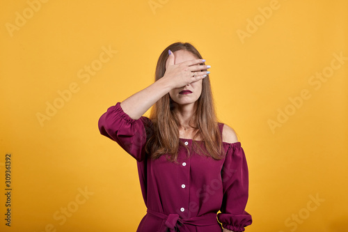 Girl in burgundy bluse hides face with hand. Behind her there is orange background. Teen looks upset and embarrassed