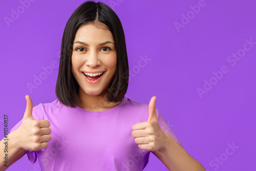Girl in purple thumbs up on . female woman gesture concept. a girl thumbs up in purple on a . a girl thumbs up in purple against a blue lifestyle.