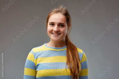 girl in yellow striped sweater smiles moderately