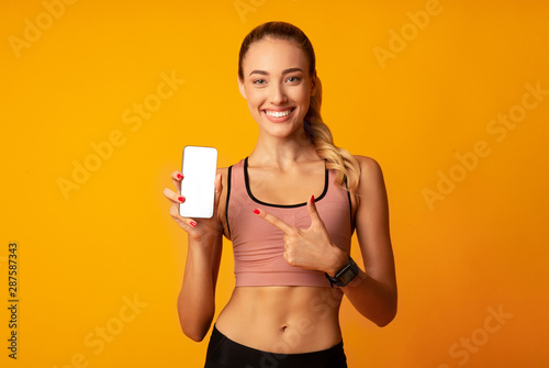 Girl Pointing Finger At Cellphone Blank Screen On Yellow Background