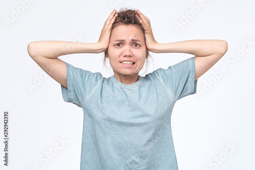 Girl screaming in terror with hands on her head, looking in panic at the camera.