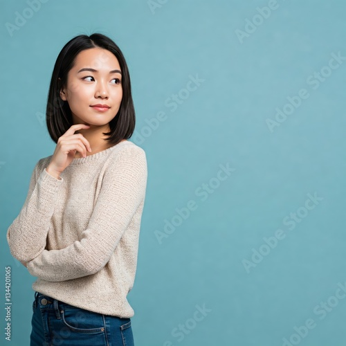 Girl standing pose looking away in casual, portrait of positive confident thoughtful asian young woman, Charming female thinking creative, thinks about future, isolated on background