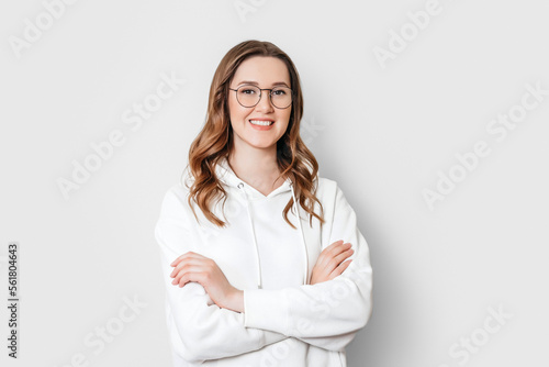 Girl student in glasses with folded hands dressed in a hoodie smiles on a white background