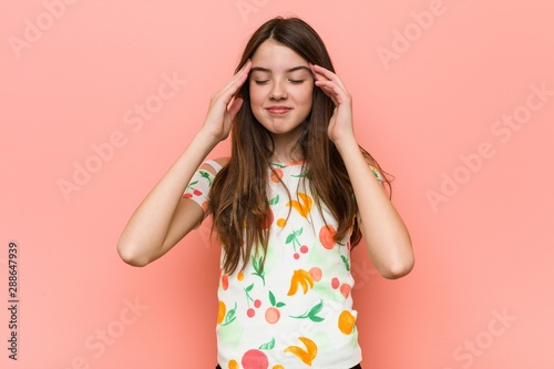 Girl wearing a summer clothes against a red wall touching temples and having headache.