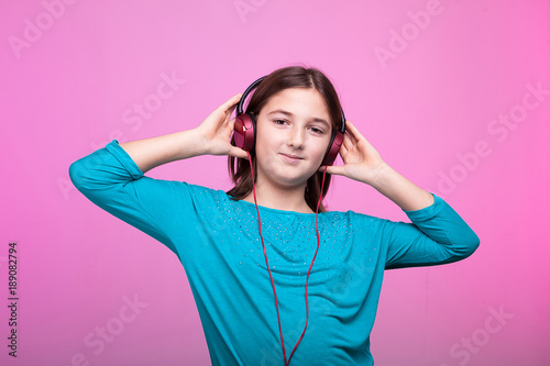 Girl wearing headphones on ears listening music on pink background in studio photo