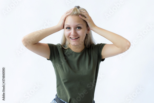 Girl with an expression of joy, hands holding her head, look up. Photo on white background