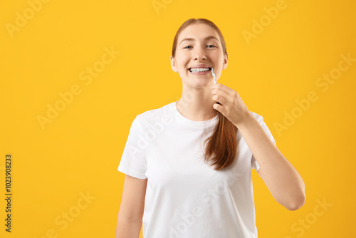 Girl with braces cleaning teeth with interdental brush on orange background, space for text