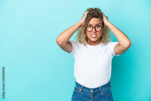 Girl with curly hair isolated on blue background doing nervous gesture