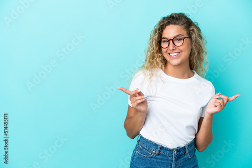 Girl with curly hair isolated on blue background pointing finger to the laterals and happy