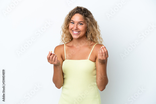 Girl with curly hair isolated on white background making money gesture