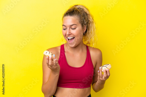 Girl with curly hair isolated on yellow background holding donuts with happy expression