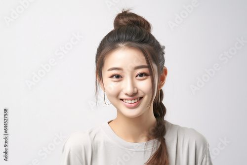 Girl with pigtails and bun hairstyle on a smoke grey background. Beautiful young woman with braided hair on grey background. Generative AI.