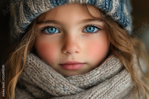 Girl with striking blue eyes wearing a cozy scarf and hat poses warmly in a winter setting