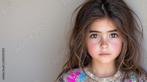 Girl's portrait, serious expression, indoor setting, neutral background, for advertising