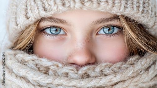 Girl's winter portrait, snowy background, eyes, close-up, cold weather, for fashion or seasonal advertising