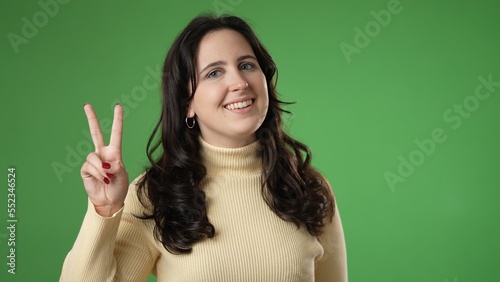 Giving peace or victory sign gesture with hands portrait of happy young woman 20s smiling and isolated on green screen background.