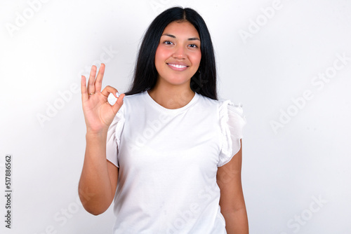 Glad attractive young brunette woman wearing white T-shirt standing against white background shows ok sign with hand as expresses approval, has cheerful expression, being optimistic.