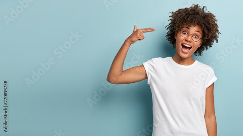 Glad dark skinned curly woman shoots in temple, tilts head, keeps mouth widely opened, dressed in casual white t shirt, demonstrates suicide gesture, isolated on blue background with blank space