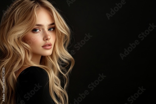 Glamorous blonde hair is on full display with this model's lustrous waves and expert beauty styling