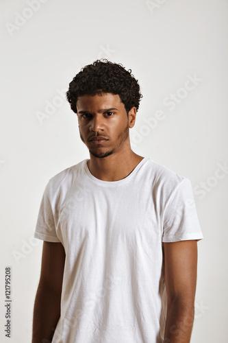 Gloomy young black model in clean white unlabeled cotton t-shirt looking into the camera