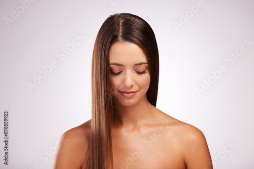 Glow, beauty and hair care of woman with eyes closed isolated on white studio background. Face, hairstyle and model in makeup at hairdresser salon for cosmetic keratin treatment, skincare and shine