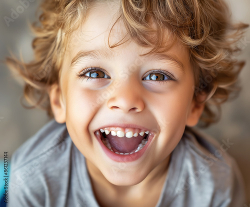 Glückliches Kind, konzentriert auf Gesichtsausdruck, lachend, Nahaufnahme