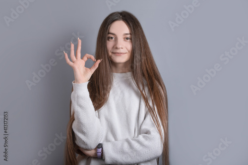 Good job. Portrait of pretty carefree modern stylish caucasian girl long chestnut hair show okay ok approval sign head pleased give positive reply like excellent service, gray background