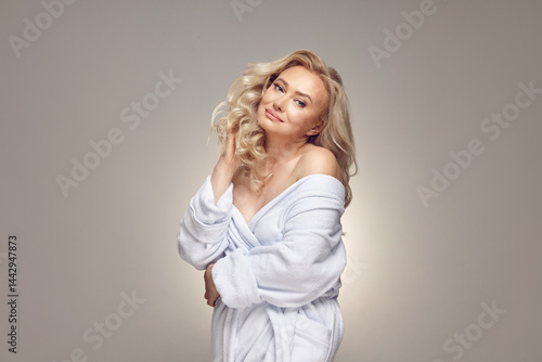 Good looking pretty mature blonde woman with a clean and healthy skin wearing spa bathrobe on a beige isolated background.
