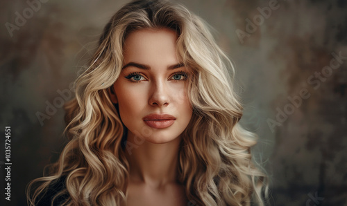 Good-looking blonde model face. Long blond hair, fresh skin and natural make-up looking at camera