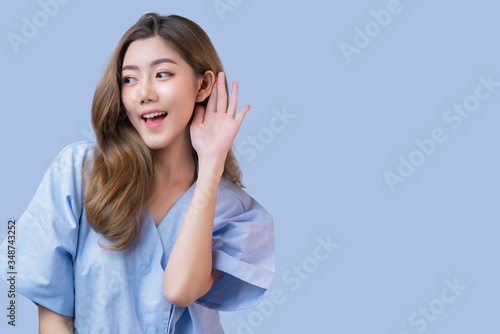 Goodnews gossip atttractive long hair asian female patient in hospital clinic uniform hand hold for help hearing happy message from somewhere isolate blue color background