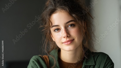 gorgeours young european woman with healthy clean skin and beautiful set of features dressed in darkgreen shirt over brown top wearing her hair loose looking at camera with shy charming smile no logo