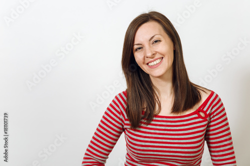Gorgeous European young happy brown-haired woman with healthy clean skin and charming smile, dressed in casual red and grey clothes, laughing and enjoying on a white background. Emotions concept.