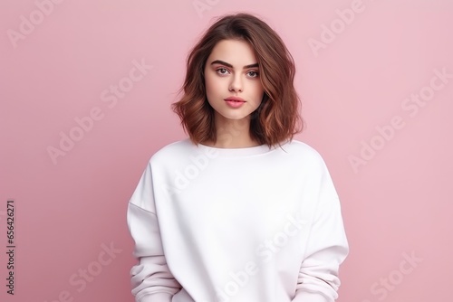 Gorgeous Lady In White Mockup Sweater, Standing In Pink Studio Background Mockup