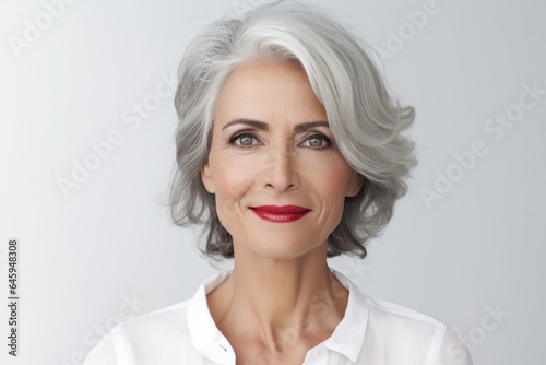 Gorgeous Senior European Lady With Red Lips and Underlined Eyes Posing on Gray Copy Space.