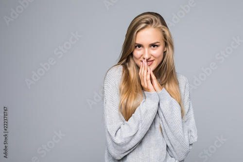 Gorgeous young brunette woman in warm knitted sweater isolated on gray background