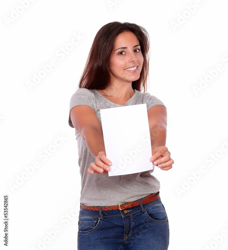 Gorgeous young woman holding a blank card