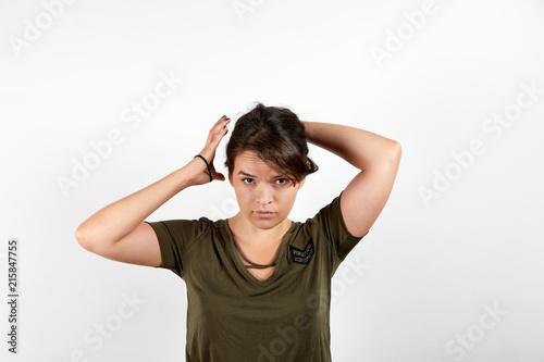 Gorgeous young woman in dark green shirt doing ponytail and looking at camera standing over white studio background