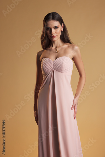 Graceful female model wearing a strapless pink evening gown with pleated bodice, posing on beige background, exuding elegance, femininity, and luxury fashion.