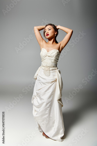 Graceful moment captured of a radiant young bride in an elegant white wedding dress