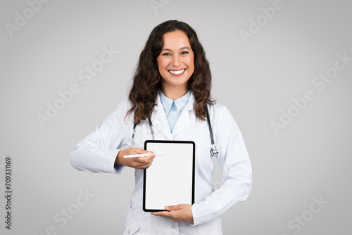 Great medical website. Doctor woman pointing at digital tablet with blank screen, showing free place for ad, mockup