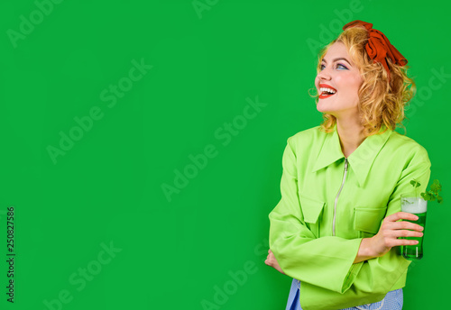 Green color, woman, clover. Smiling woman holds glass with green beer. Green beer. Saint Patrick's Day. St Patricks Day. Green beverage with clover. Irish Traditions. Pub. Woman drinking beer in pub.