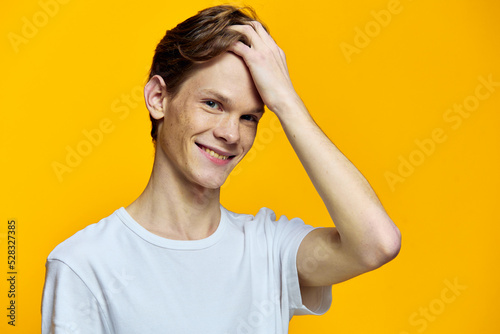 guy in a white t-shirt posing on a yellow background with his hand to his head
