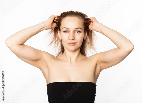 gymnastics for a face, woman doing anti-aging exercises. beauty and health concept