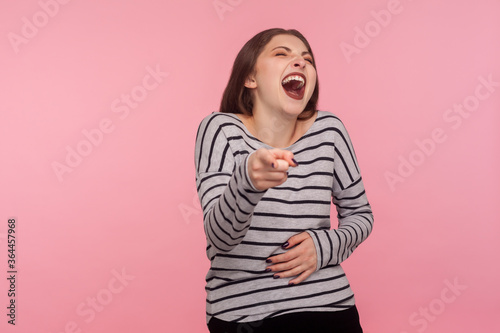 Ha ha, you're ridiculous! Portrait of woman in striped sweatshirt pointing fingers to camera and laughing out loud, teasing funny friend appearance. indoor studio shot isolated on pink background