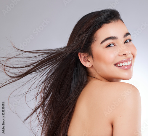 Hair care, studio and portrait of woman with confidence for shampoo shine, wind and satisfaction. Person, smile and happy with treatment for hairstyle, pride and healthy texture on white background