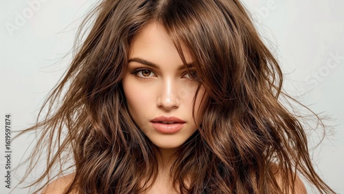Hair Glossing. Beautiful brunette woman with wavy hair portrait close-