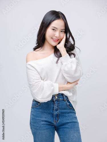 Half body portrait happy smile young asian beautiful woman curly hair wearing long sleeve shirt, blue jeans outfit, casual standing pose on white background joy positivity fashion lifestyle concept.