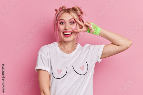 Half lenagth shot of positive young European woman with two buns gesture peace gesture over eye smiles gladfully wears t shirt and sport gloves has vivid makeup isolated over pink background.