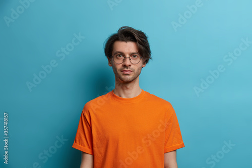 Half length shot of serious confident brunet man stands with hands down and looks focused at camera, listens information with enthusiasm, wears round spectacles and orange t shirt. People, youth